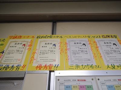 単元のまとめをワークで確認中。学級の掲示をみると、合唱祭の三冠達成!おめでとう!