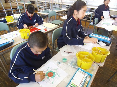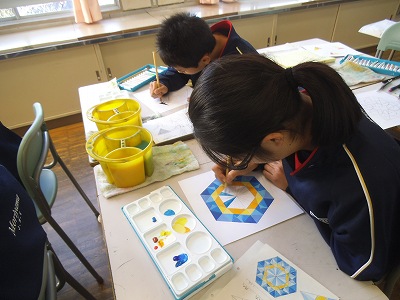 1年美術。デザイン画、出来てきました。なかなかの作品になりそうですね。