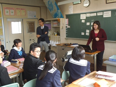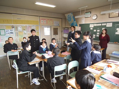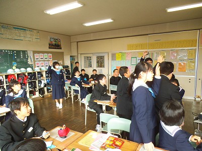 1年生の英語。発表はバトル!どちらが先に手を挙げたか、ほとんどが同時。発表権を争ってジャンケンも気合いが入ります!やる気満々です!