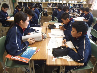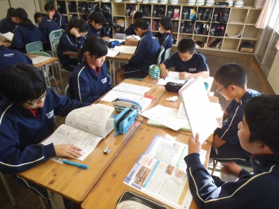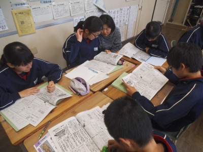 班で自分の書いた新聞を発表しています。さて、先生はどこでしょう?見つけられるかな?