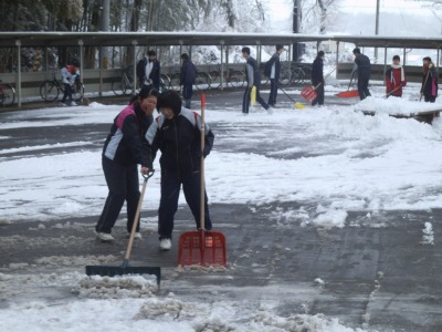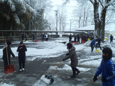 人数が多いとあっという間。雪をかいてアスファルトが見えてきました。