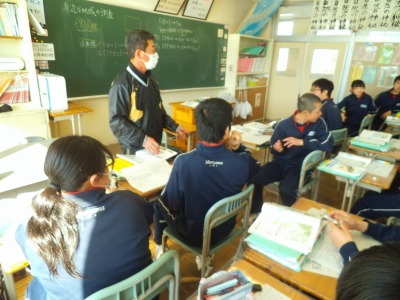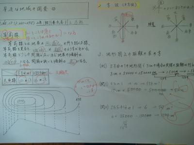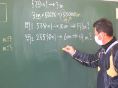 縮尺から実際の距離を求めましょう。センチメートルを5万倍してキロメートルにすると・・・。