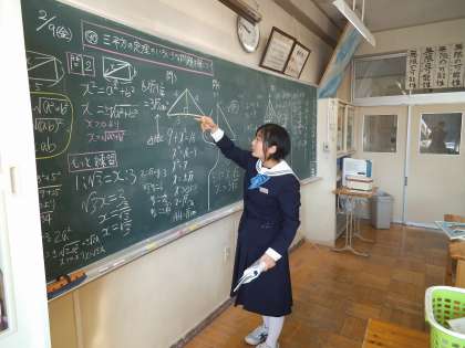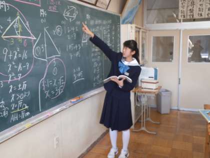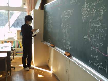 3年3組では、数学の時間に三平方の定理を使って解くいろいろな問題に取り組みました。解いた問題を板書し、それを発表するという形で授業を進めていました。生徒は、自分が説いた問題を堂々とみんなの前で発表していました。