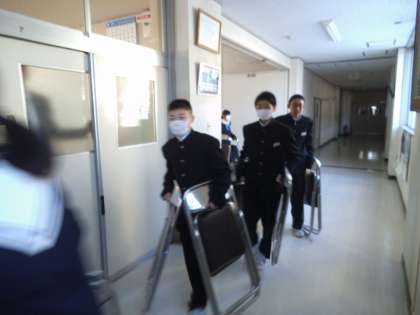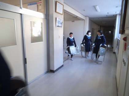 先週金曜日に平成30年度新入生保護者説明会を2階ホールで行いましたが、その会場においていたパイプ椅子を、今朝2年生が体育館へと運び、片づけてくれました。卒業まで後1ヶ月となってきましたが、学校で行われるいろいろな行事を2年生があらゆる場面でサポートし、活躍しています。