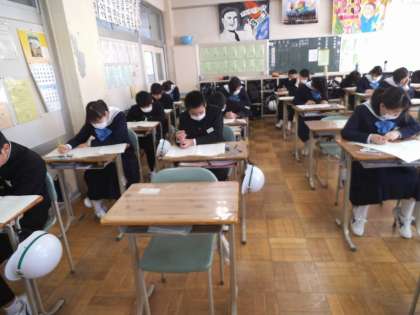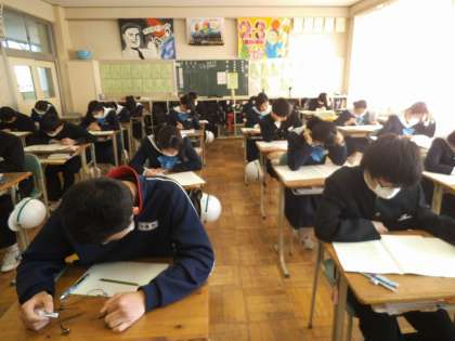 3年3組の英語のテストの様子です。長いヒアリングテストがありました。それが終わって、問題に取り組んでいる様子です。みんな頑張って取り組んでいました。