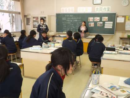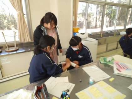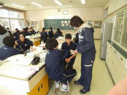 2年2組、3組の女子保健体育では、「けがの応急手当」について、体育教員と養護教諭がTTで研究授業を行いました。「きずの手当の方法を実習を通して理解しよう」とのめあてのもと、生徒はペアになり、応急手当てについて真剣に実習に取り組みました。腕をけがしたという想定で、血を赤のビニールテープで表現し、止血し、包帯を巻く実習を行ました。包帯のまき方が上手で先生に褒められるペアがたくさんいました。