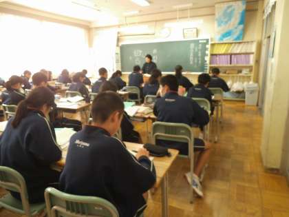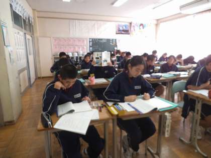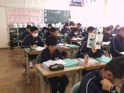 3年3組では、国語に時間に「挨拶、原爆の写真に寄せて」という口語自由詩の音読を行いました。一人が一文を読んだら次の人が読むということで行っていました。