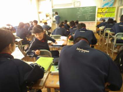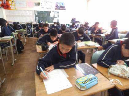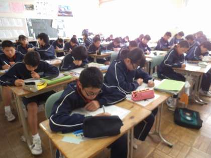 2年2組では、数学の時間に次の単元を行うにあたり、今現在どのくらいの知識があるかを確かめるための準備テストを行いました。生徒は、問題に対し、真剣に取り組んでいました。