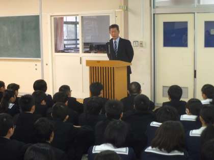 生徒発表に続いて、生徒指導主事から全校生徒にお話がありました。「冬休み事故がなくみんな揃って始業式が迎えられてよかった」「新年に目標を持ったと思うが、その実現に向けて一人ひとり頑張って行きましょう」とのお話がありました。