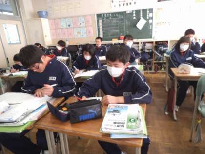 2年3組では、数学の時間に明日から始まる第4回定期テストに向けて、証明問題の確認を行いました。生徒は、それぞれ問題に取り組み、証明問題の解き方を確認していました。