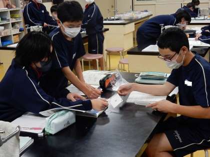 1学年・理科の授業では、「力のつり合い」の学習に取り組んでいます。「物体にはたらく2力がどんな関係のときに物体は静止するのだろうか?」という学習課題のもと、グループごとに実験を行いました。その結果をふまえて、1つの物体にはたらく2力のつり合いの条件が「2力が一直線上にある」「2力の大きさが等しい」「2力の向きが逆向きである」ことを理解することができました。