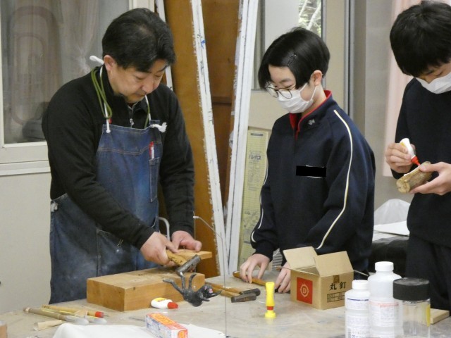 2-3美術です。木の幹をデザインの一部にして彫刻を作っています。すばらしい作品を...