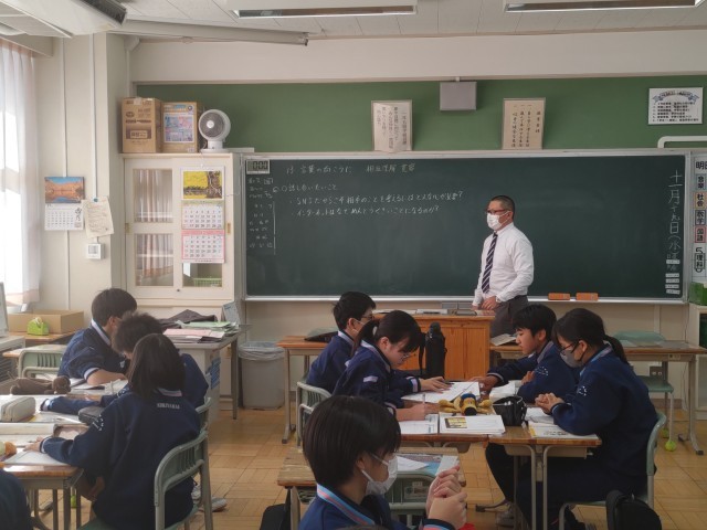本日11月19日(木)の5校時目に教員5年目の先生による道徳の研究授業がありました。教科書のSNSに関するトラブルの資料を基に、自分たちで相互理解、寛容に関するみんなで話し合いたいテーマを考え、クラスみんなで考えたテーマについて話し合うという授業でした。みんなで話し合った結果のテーマは「インターネットでトラブルを防ぐためには」でした。SNS等でのトラブルを防止するために、相互理解や寛容を中心に話し合いました。