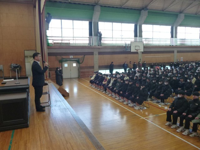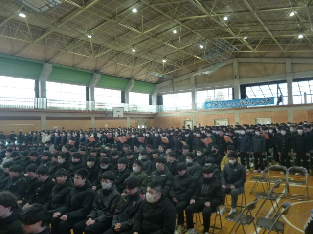 今日12日(木)の午後には第1回卒業式全体練習がありました。各学年でそれぞれ卒業式の練習はしていますが、全校生徒が一堂に会して練習するのは今回が初めてです。最初に校長から卒業式の意義について話があり、次に生徒指導担当から礼の仕方についての指導、そして音楽の先生の指導による式歌の練習を行いました。最初は声が出ませんでしたが、だんだんと声が出るようになってきました。