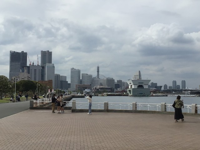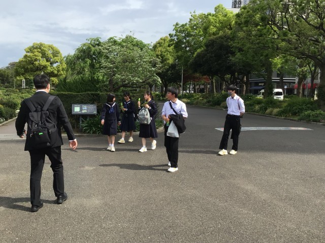 判別自主研修の集合場所は山下公園です。すでに研修を終えて公園に到着している班もあります。