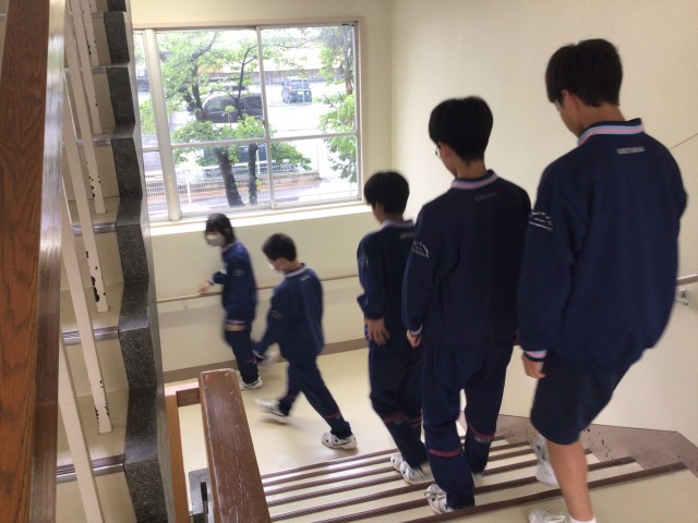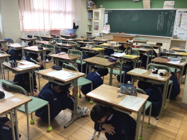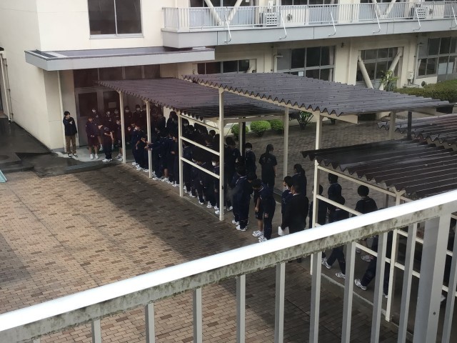 6校時目に、地震を想定した避難訓練が行われました。まずは、落下物から身を守ること。次に、校舎から避難するための経路を確認しました。冷静な行動が、命を守ります。雨天の中、落ち着いて行動ができました。