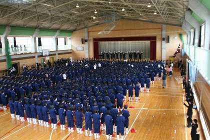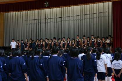 今年度最初の激励会でした。陸上部の選手紹介と決意表明の後に、応援団による応援がありました。団長を中心に熱心に応援していました。1年生にとっては初めての激励会でしたので、早く応援の仕方を覚え、同じ中学校の仲間に心のこもった応援ができるようにしてほしいものです。次回の激励会ではさらに盛り上がることを期待したいと思います。