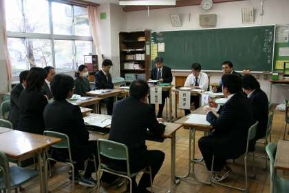 本日8日(火)に4名の郡山市教育委員会学校教育課指導主事の先生方に指導助言をお願いし、校内授業研究会を行いました。今回は、国語(2−3相楽先生)、数学(1−9齋藤先生)、英語(2−6菅野先生)、理科(2−5長津先生)、社会(2−8青木先生)、保体(1−4,5,6女子佐久間先生)の6教科の研究授業と分科会を行いました。本校では、教育目標の実現のために、毎年研究主題を設定して研究に努めています。今年は、「生き生きと学ぶ生徒の育成」〜一人一人の能力を伸ばす指導の工夫〜という研究テーマで取り組んでいます。分科会では、提供していただいた授業について、また今後の授業や教育活動について有意義な話し合いを持つことができました。指導助言をいただいたことを今後に生かし、より授業改善に努めて参りたいと考えております。本日お忙しい中ご指導をいただいた郡山市教育委員会学校教育課指導主事の先生方に厚く御礼申し上げます。