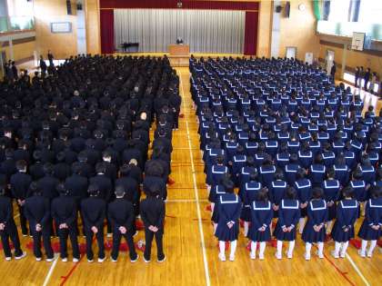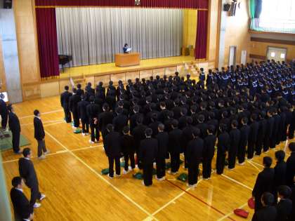本日10日(火)第3学期始業式を行いました。校長先生から、「飛躍の1年になるよう祈念しています。3年生は進路決定、1,2年生は進級に向けた総まとめの学期。卒業、進級に向けて努力してほしいことは、1 思いやりの心を大切に、2 学ぶ心を持ち続けたい、3 愛校心を高めたい。有終の美で終われるよう努力してほしい。」と式辞がありました。生徒会長からは、「エコキャップ、あいさつ運動は今後も続けていくので協力して下さい。六中生が六中に誇りを持ち、六中魂で活躍していくことを祈っています。」とあいさつがありました。