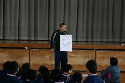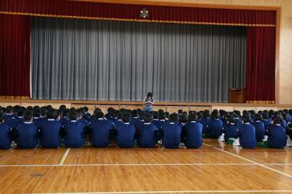 本日9日(月)に2学年の学年集会と学年レクを行いました。第1部の学年集会では、学年スタッフの自己紹介がメインでした。第2部の学年レクでは、「学級担任のすてきな笑顔を描こう」という内容で、1人20秒ずつ描く時間を設けてクラス全員で協力し合って担任の先生の似顔絵を仕上げました。また、「ピンポン球レース」では、お玉にのせたボールをバトン代わりにして競争をしました。クラス替えをしたばかりで緊張感をもって生活していましたが、たくさんの笑顔を見られた時間になりました。