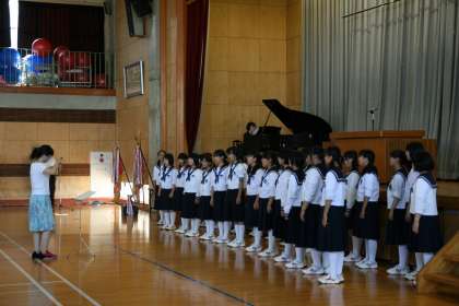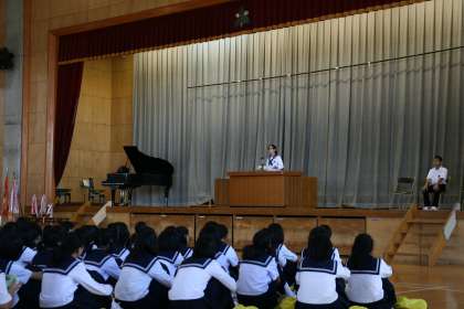 また、生徒会長からは、「夏休みは文化部も運動部も目標を持って頑張ってきました。2学期は一人一人健康に気をつけ1学期以上の活動を心がけましょう。様々な行事が充実していくようにしましょう。一人一人が自分にご褒美を与えられる2学期にしましょう。」という話がありました。その後、英語弁論発表、合唱部の発表、表彰伝達などがあり、夏休み中の努力の成果を垣間見ることができました。