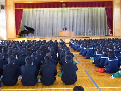 本日22日修了式を行いました。1,2年生の代表生徒へ修了証書を授与しました。校長先生からは、「尊敬に値する先輩になってほしい。学校の大きな柱になって活躍することを期待している。」と式辞がありました。本日修了証書を手にした生徒は、1学年254名、2学年260名です。1年間大きな事故や問題もなく無事に修了できたのも、保護者の方や地域の方からのご理解とご協力のおかげです。この場をお借りして御礼申し上げます。ありがとうございました。なお、明日より春休みになります。この春休みは新しい学年でよいスタートを切るための準備期間です。充実した春休みを送れれば、充実した新年度を送ることができます。1日1日を大切に過ごしていけるようご家庭のサポートをよろしくお願いします。また、地域の方にも何かとお世話になることがあると思いますが、どうぞよろしくお願いします。