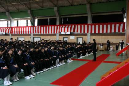 午後からは入学式。真新しい制服に身を包み、新入生241名が入学しました。「1日も早く学校に慣れてほしい。勉強や運動に一生懸命取り組み、様々な分野で力を発揮してほしい。」と式辞がありました。その後、生徒会長の金澤君から「共に頑張っていきましょう。」と、新入生代表の後木君から「中学校生活を充実させていく。」といった力強い誓いの言葉がありました。