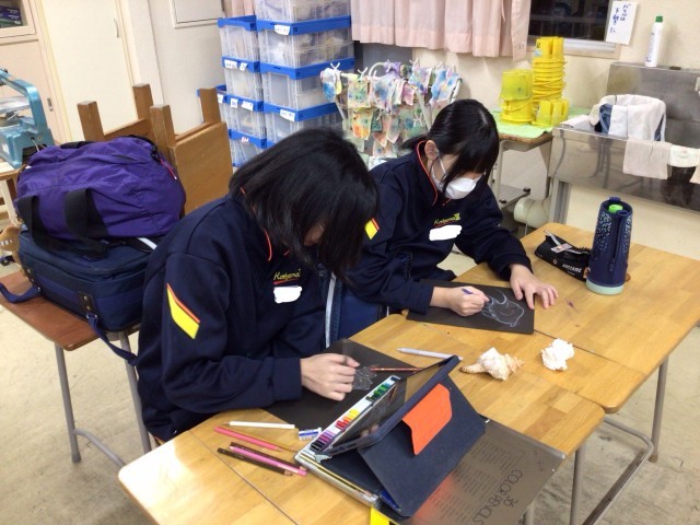 総合文化美術部の活動の様子です。今日は貝殻の絵を描く活動でした。とても上手に描けていました。
