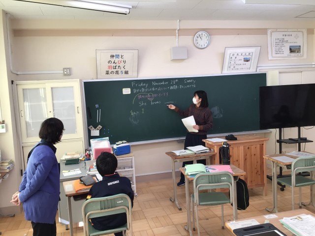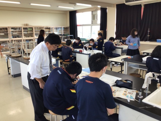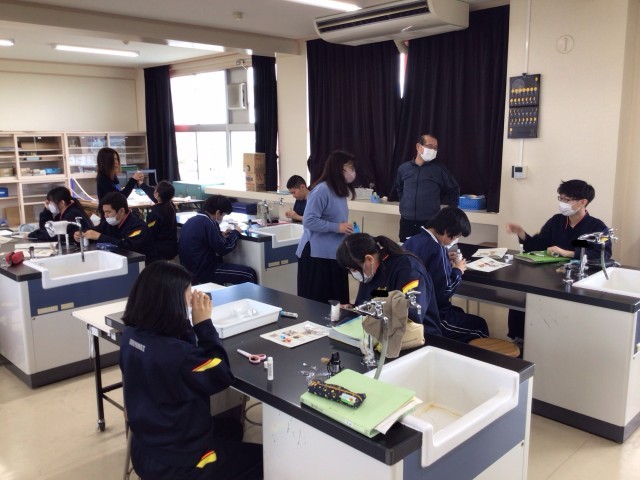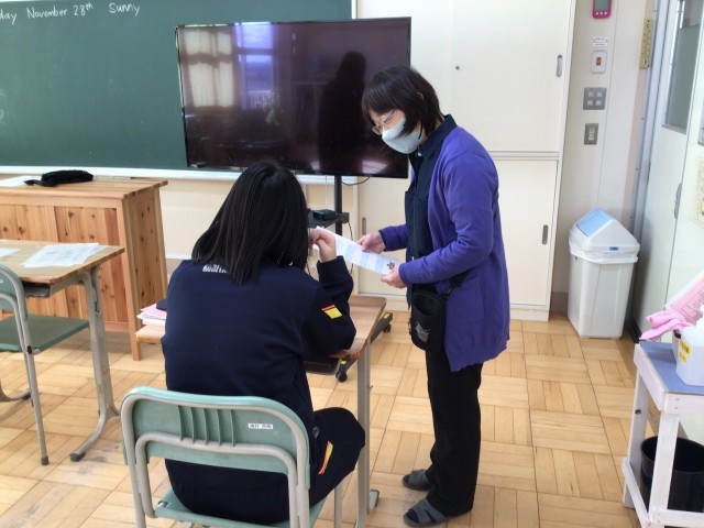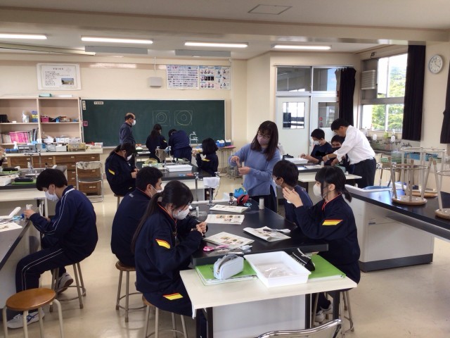 菜の花学級の授業の様子です。英語と理科の実験の様子です。英語では英会話をしながら楽しく学んでいました。理科では万華鏡づくりを行い、綺麗な模様を観察できました。