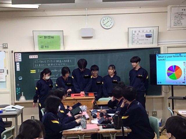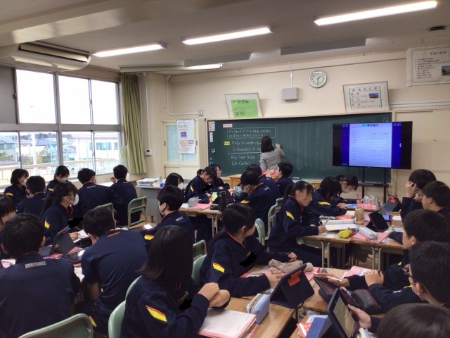 2年3組の英語の授業風景です。先生と英語で受け答えをしながら、各班ごとに本時の目当てに応じた発表をしました。タブレットをフルに活用し生徒主体の授業が展開されていました。他のグループの発表の良かった点を英語で伝えていました。