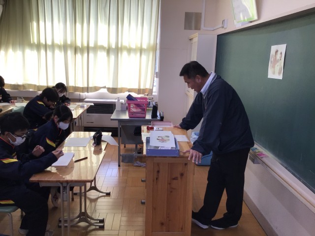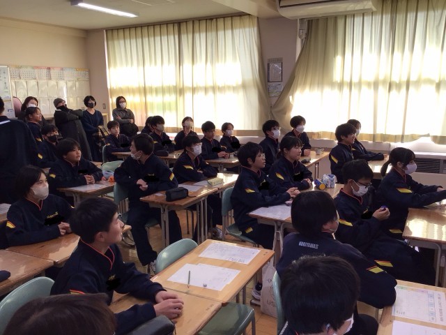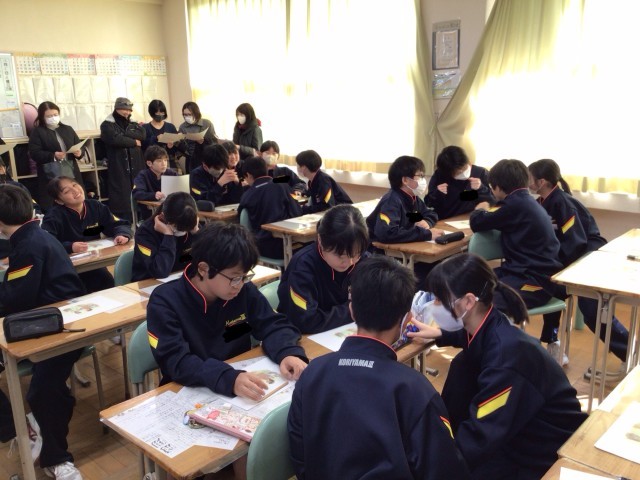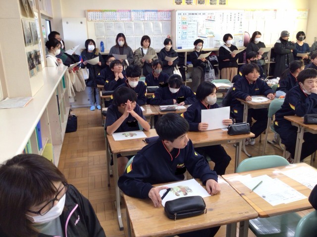 1年4組の授業参観での国語の様子です。和やか雰囲気からスタートして、主人公の母親に対する気持ちの変化を読み取り、一人一人が自分の家族について考える時間でした。中学1年生らしく素直な表現が印象的でした。