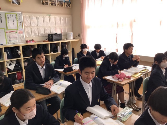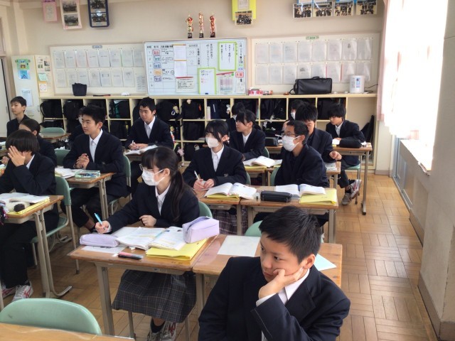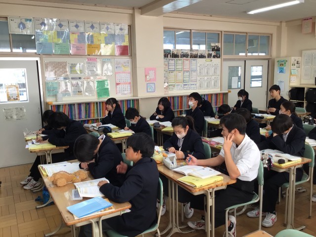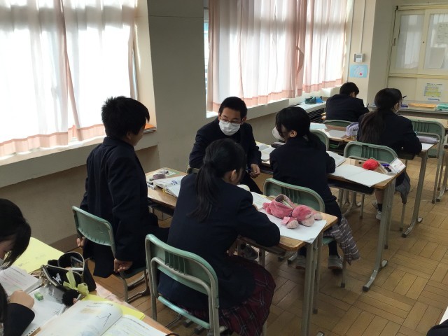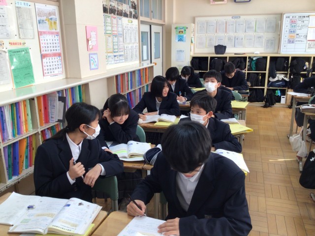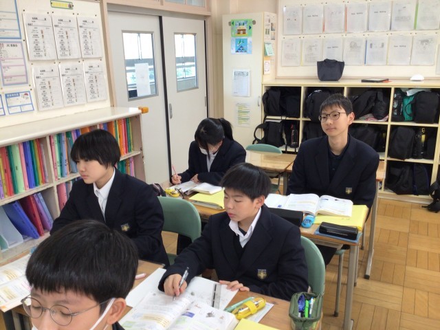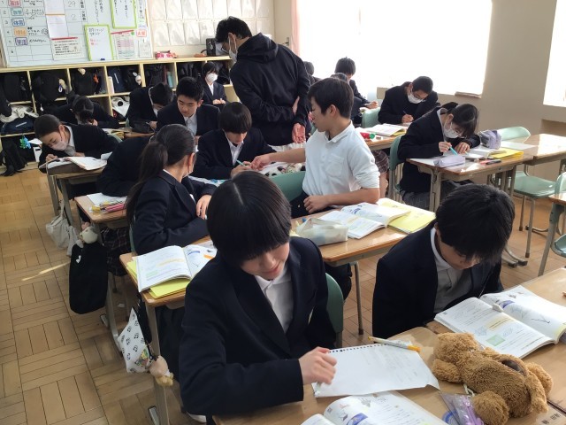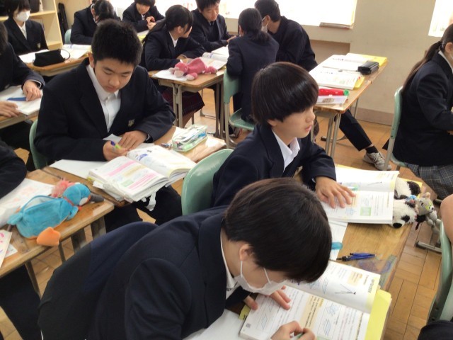 1年2組の数学の授業風景です。図形の課題に取り組んでいました。まずは自力で取り組み、その後ペアやグループ学習で多様な考え方を知り学びを深めていました。
