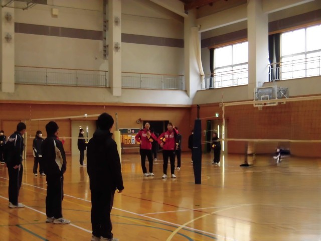 昨日は、本校においてふくしまの夢応援事業「デンソーエアリービーズドリーム教室」が行われました。郡山市をホームタウンとするSVリーグ女子バレーボールチーム「デンソーエアリービーズ」の選手ならびにスタッフの皆さんとともに、3校時は体育館で実際のアタックやレシーブなどのプレー(実技)を中心とする運動プログラムにより、チームワークの大切さを学びました。続いて4校時は、夢を持つことの素晴らしさ、挑戦することの大切さなど選手の皆さんの実際の体験や経験をもとにした「夢の講話」をうかがうことができました。プロとしてリーグの最前線で活躍する選手の皆さんから実際の指導を受けたり講話を聴いて考えたりと、普段の学校生活では決して学ぶことのできない貴重で有意義な時間を共有した高瀬中生は、最後の給食の時間には、エアリービーズの皆さんとともに、笑顔で楽しく交流をはかることができました。エアリービーズの皆さん、ありがとうございました。