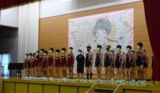 引き続き市中体連陸上大会選手激励会を行いました。出場生徒一人一人から出場種目と決意発表があり、応援団が選手へ太鼓の音に合わせてエールを送りました。大会では練習の成果を発揮してほしいと思います。
