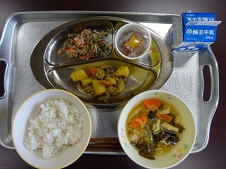 本日の給食は、麦ごはん、納豆、変わり納豆の具、カレー肉じゃが、わかめと大根の味噌汁のラインナップです。普段と味が変わるとまた違った味わいとなり、おいしくいただきました。ごちそうさまでした。