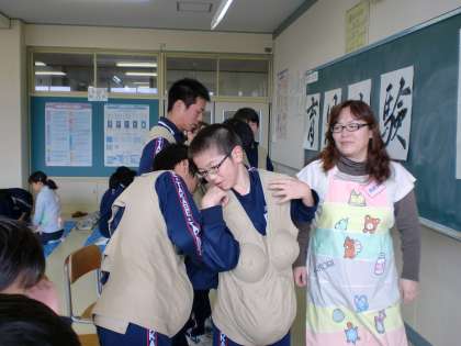 11/26(金)3・4校時に育児体験講座がありました。2年生全員が取り組み、貴重な体験をしました。男子も妊婦体験(10キログラムのおもりのついた服を着る)、おむつ交換・授乳などの体験をしました。自分が10年くらい前にやってもらっていたことですので、照れくささもありましたが、貴重な体験だったと思います。