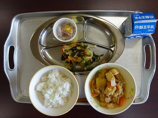 本日の給食は、あさか舞ごはん、納豆、大根とわかめの中華和え、じゃがいもと豚肉の煮物のラインナップです。地場産物活用献立ということで、あさか舞のおいしさを十分味わいました。ごちそうさまでした。