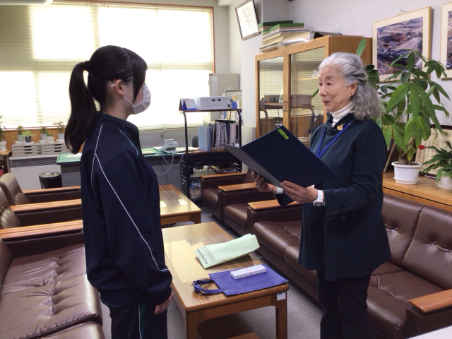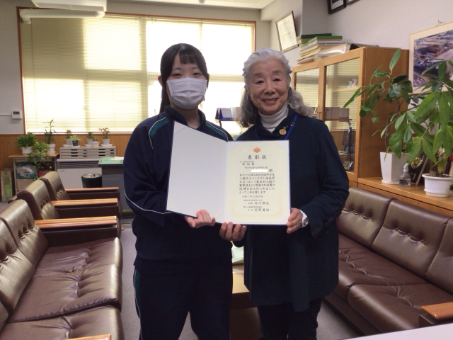コミュニティスクール学校運営協議会委員でもあり、郡山市の人権擁護委員でもある齋藤鈴子様より、校長室にて3年生に奨励賞が贈られました。受賞おめでとうございます。齋藤様には、毎年全学年の人権教室を行なっていただいております。