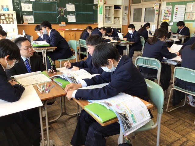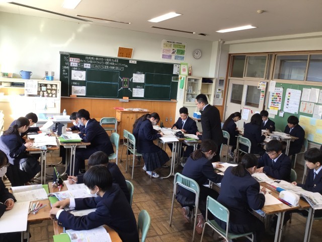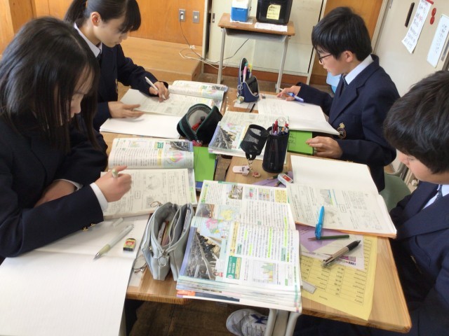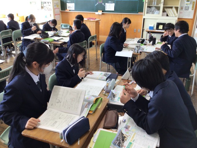 1年生は現在、地理分野を学習しています。班でそれぞれの考えを共有しています。