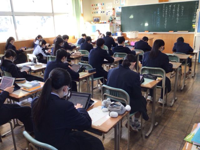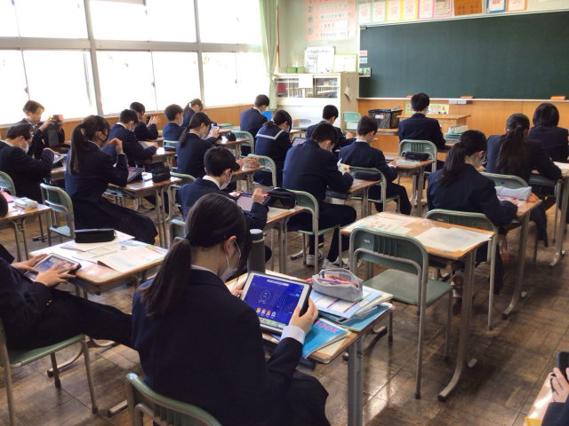 2年生では週に1回、朝の時間にスタディサプリに取り組んでいます。教科や単元を自分で決めて、それぞれのペースで取り組んでいます。
