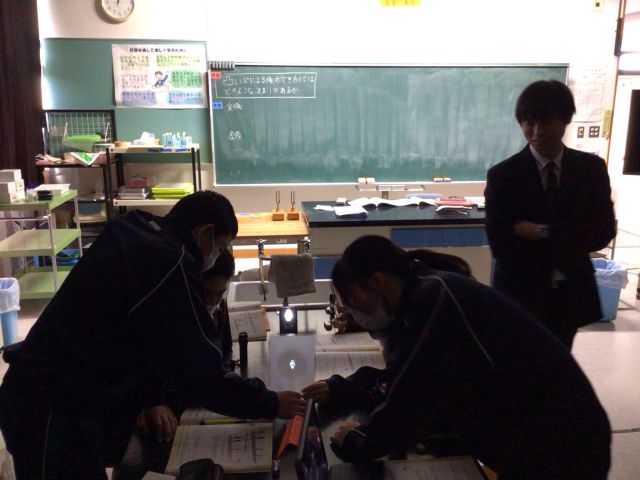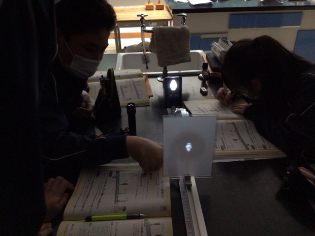 理科室では、1年生が「凸レンズによる像のでき方」について実験、考察していました。みなさん真剣です。