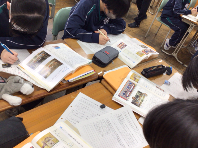 2年生の教室では、レオナルド・ダ・ヴィンチの「最後の晩餐」についての説明文を書いていました。みなさん真剣に取り組んでいます。