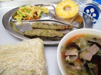 今日の給食は今年最初の「麺」メニューで、タンメン・牛乳・ししゃも磯辺フリッター・キャベツのキムチ和え・パインでした。
