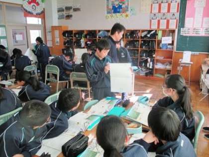 今日の写真は、先週15日(金)に行った2年社会の研究授業の様子です。中部地方の工業、農業、地場産業について調べた内容を、交流班の中で自作資料をもとに発表する授業でした、説明を聞いた班員は、疑問に感じたことや分からないことを自由に質問したり、タブレットを使って即座に調べたりすることで、理解を深めていたようであす。