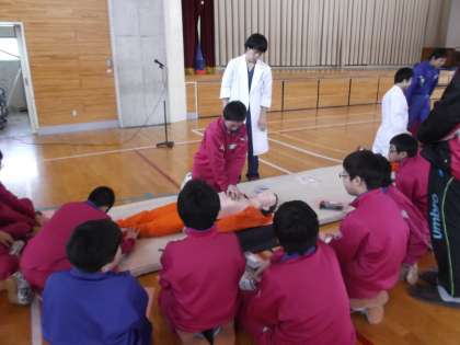 実習では生徒ひとり一人が講師の先生の指導のもと,人工呼吸や心臓マッサージの仕方を人形を使って行いました。皆さん真剣に取り組んでいました。