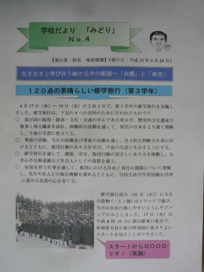 本日、学校だより「みどり」第4号を発行いたしました。