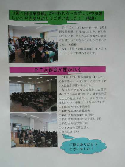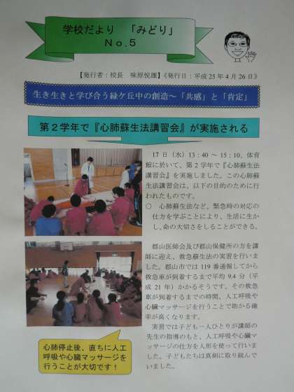 記事の内容は、「第2学年で『心肺蘇生法講習会』が実施される」「『第1回授業参観』が行われる〜お忙しい中お越しいただきありがとうございました!」「PTA総会が開かれる」です。