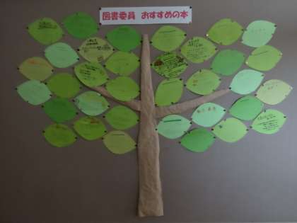 本校の図書室は、司書補の遠藤さんや図書委員会の子どもたちによっていつもきれいに整美されています。図書室を明るく入りやすく、そして図書室に自然と足を運びたくなるような雰囲気をつくるため、図書室前廊下掲示板に「新着図書」や「おすすめの本」の紹介を工夫して掲示してあります。