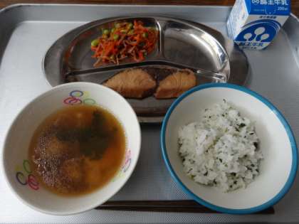1月8日(水)、3学期最初の給食のメニューは、【鏡開き献立】「菜めし、白玉雑煮、ぶりの照り焼き、いか人参、牛乳」です。