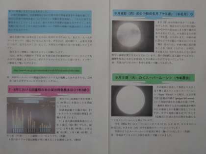 記事の内容は「三連休の事故防止をお願いします!!」「9月10日(水)〜9月16日(火)は『自殺予防週間』です〜みんなでつくる、自殺に追い込まれない社会<内閣府>」「7・8月における図書館の本の貸出冊数最多は◇1年3組◇」「9月8日(月)の◇中秋の名月「十五夜」(芋名月)◇」「9月9日(火)の<スーパームーン>(今年最後)」と盛り沢山です。